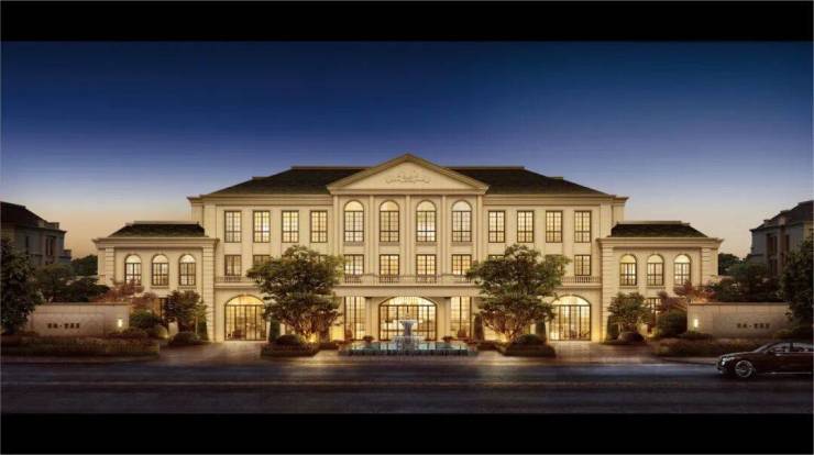 联排建筑的设计,融合了中国传统院落布局与法国枫丹白露宫的审美,外立面大面积采用全石材干挂,檐口等细节部位使用仿石。