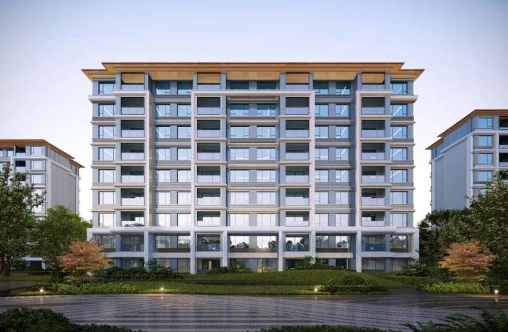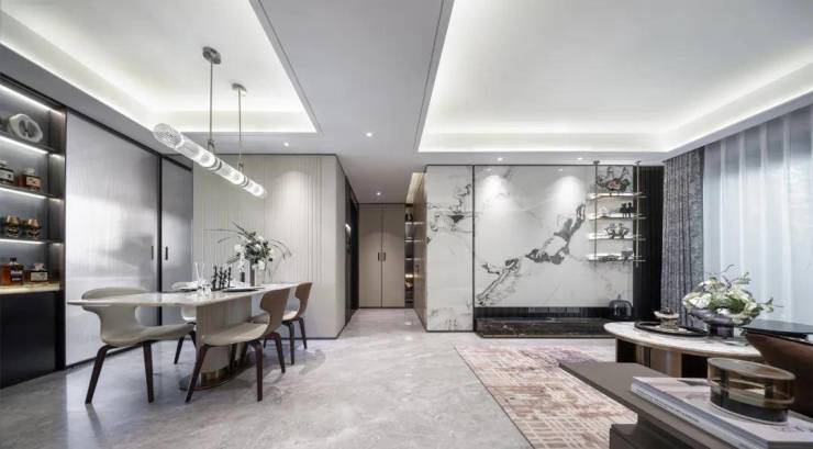 建筑设计层面,金茂府巧妙融合经典与现代,采用三段式构图,顶部暗金色铝板挑檐与浅色香槟铝板线条交相辉映,深色香槟铝板窗套搭配暖灰色真石漆,尽显东方韵味与现代奢华的和谐统一。