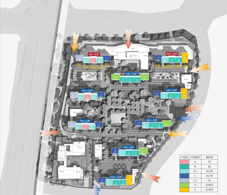 •绿化率: 36% ; •总户数:1380户;规划9栋29~34层超高层,2梯5户设计,楼间距:28~55米;车位:1426个;