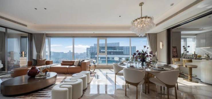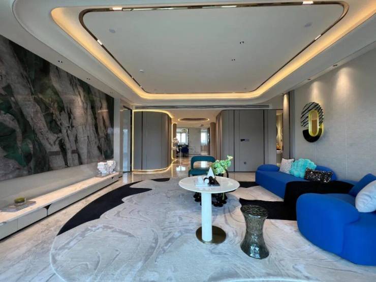 步入样板房内,目之所及,遍布多种玉石 卡里冰玉,世纪冰玉、红花冰玉、白雪公主、芬迪白、喜马拉雅灰、雪山蓝等名贵奢石+天然贝母等,将“奢华”二字堆砌得恰到好处;