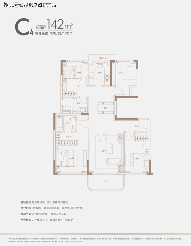 建面约140㎡四房:三开间朝南户型,南北通透,采光条件优质,客厅明亮宽敞,彰显大气布局。