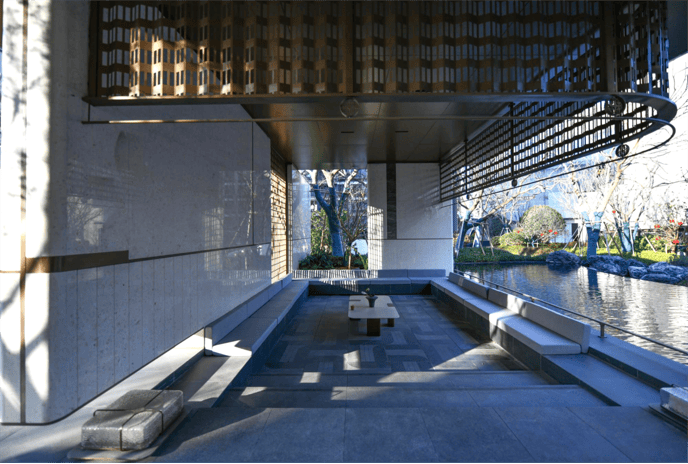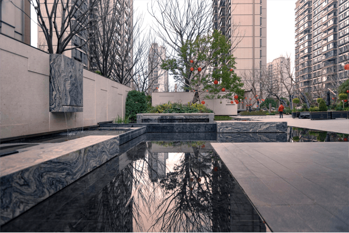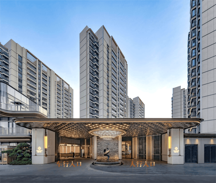 穿过大门,首先映入眼帘的是入口水景,即是南北轴线与东西轴线的交汇起点,又以水的灵动与柔美,为归家之路增添一份静谧而庄重的仪式感。