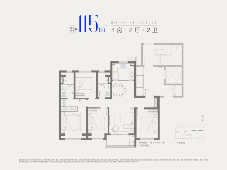 建面约115㎡4房2厅2卫,做到了四开间朝南+全卧室带飘窗+主卧套房设计,一步到位的大四房户型。兼顾大4房的功能性和空间尺度,非常难得,更适合四口之家或三代同堂家庭居住。
