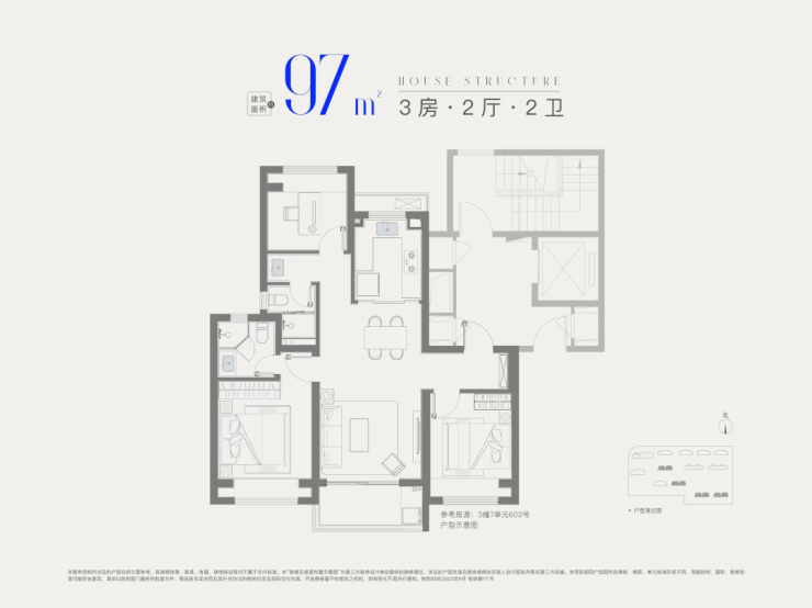 建面约97㎡3房2卫,升级版大3房,入户玄关+主卧套房设计,整体私密性更强,空间更为宽敞。