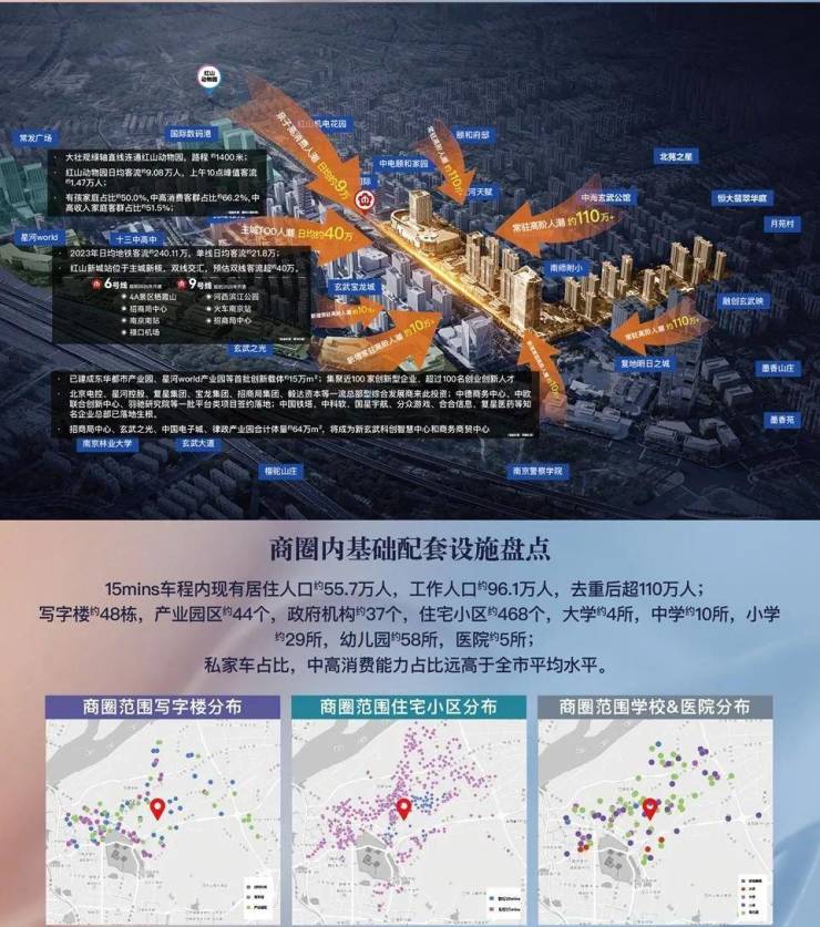产业心:新玄武是座产城融合的新城,产业是重中之重,总计60万方的科技研发产业载体,包含招商、复兴、宝龙、星河、玄武之光、南京国际数码港、红山国际社区7大产业总部基地建设,未来将容纳至少15万的高精尖产业人群