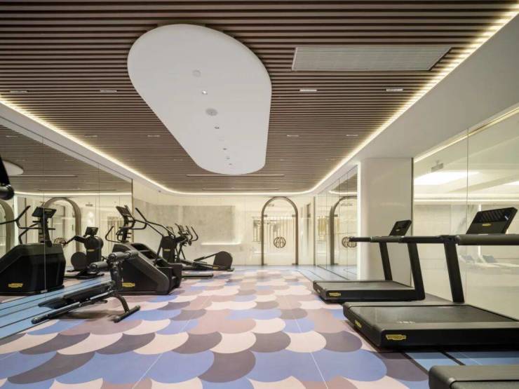 客厅外面,电动开启窗徐徐降下,实现了阳台的功能,这得值一辆特斯拉。隐藏式晾衣架和健身区,对着江景撸铁、跑步,这里要是不过瘾,楼下还有泳池健身会所,满足一家人多样的健身需求。
