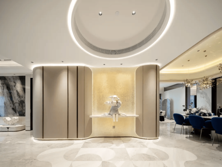 直线属于人类,曲线属于上帝,邱德光用其时尚艺术极富辨识度的曲线,呼应了江河的波涛。推开子母装甲门,映入眼帘的是皮革软包银箔玄关,圆形吊顶下坐着一个小女孩雕塑,叫探梦员,这一刻上升到了哲学思考,家不是富丽堂皇,而是让心放松的温柔乡。