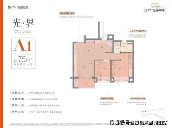 户型设计上,保利虹桥和颂预约热线:400-000-0460转6666【预约☎】,品质改善为出发点,设计“私属、至臻、尊崇”三大产品理念,臻奢建面约75㎡户型,三开间朝南,阳光与清风为伴,玄关+餐边柜+飘窗,全能收纳,卫浴三分离,干湿有别,奢阔餐客厅一体,空间明朗,动线流畅。
