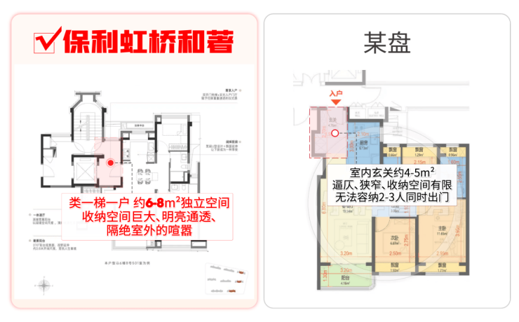相比其他百平米3房玄关的逼仄、收纳空间少的问题,保利虹桥和著本次所有户型都做到了类一梯一户,享全明独立电梯厅: