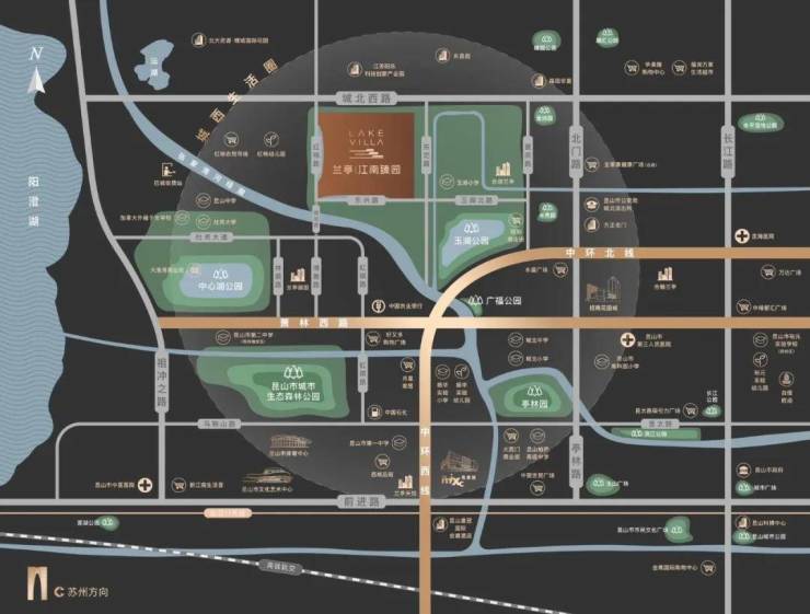中心湖公园、昆山森林公园、玉湖公园等生态绿境在侧,氧护生活;