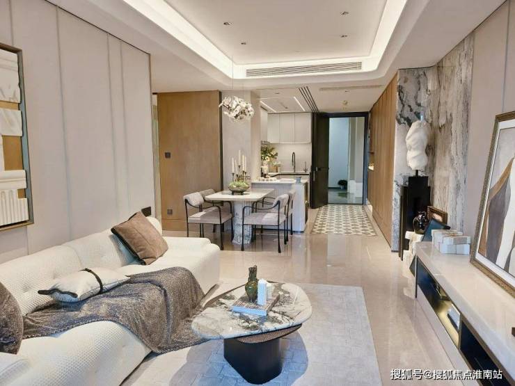电视背景墙采用卡慕白的石材+皮革造型,弧形吊顶,相当讲究,连空调出风口的形状都打造为海上·清和玺logo山茶花的形状~~三大件为大金(或同等档次)中央空调和地暖,新风系统为百朗(或同等档次),南向阔景阳台,采光视野一级棒!