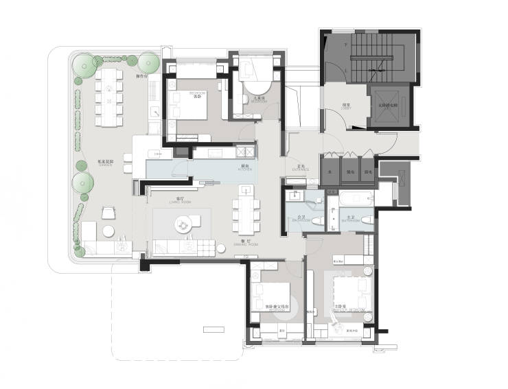 规划打造约30-50m²的多样化庭院,满足了一个人的狂欢到四个人的派对等一系列的休闲娱乐方式。