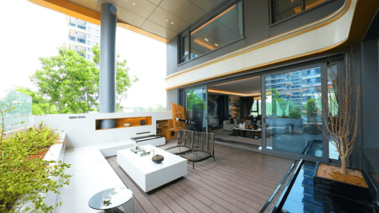 建面约433㎡空中跃层,以空中合院为概念打造6.2米挑高空中花园,营造垂直森林的体验。置身于内,超尺度客厅向外延伸,城市风华近在眼前,山水之气质跃现,云间花园如诗如画。