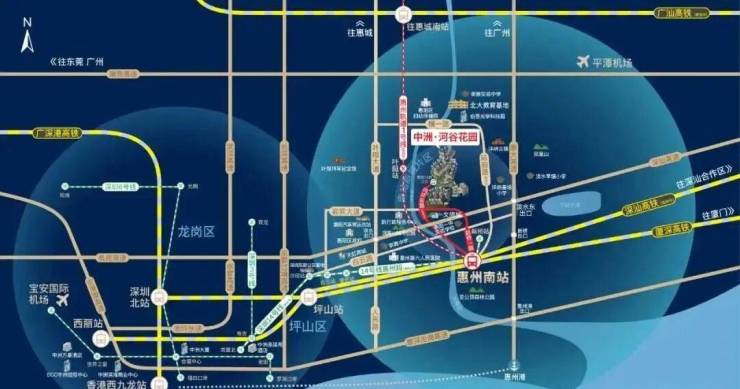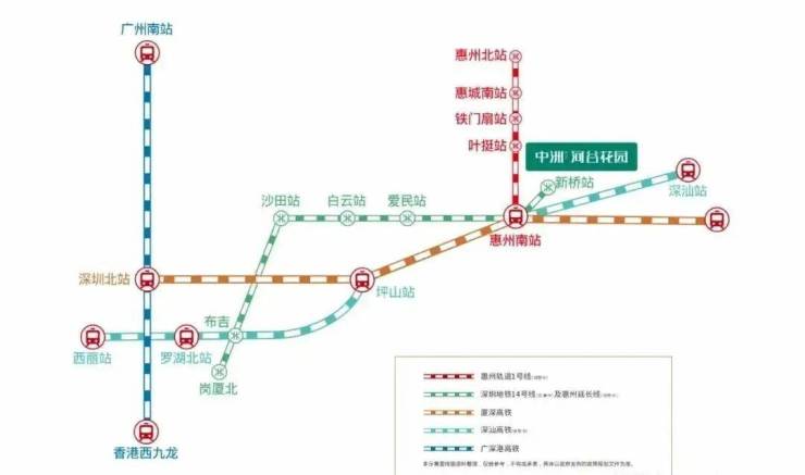中洲河谷花园在惠州南站是粤港澳大湾区重要综合轨道站之一,厦深高铁约28分钟直达深圳北,约68分钟到达香港西九龙;深圳地铁14号线(在建中)延长线(规划中)官宣1-2年内动工,中洲河谷花园近距离惠州南站、新桥站双地铁口(规划);