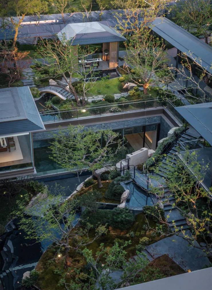 通过下沉会所庭 院,将传统平面绿化转化为垂直的多层次园林空间, 打造出了当代立体山体水景观 ,身处其中在步履起承转合间,串联起一幕幕诗画风景。