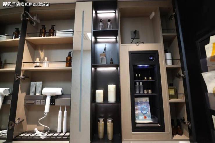 整面墙的镜柜,内部配备了美妆冰箱+门板收纳架+轨道式置物架,储物空间打造的非常充足。