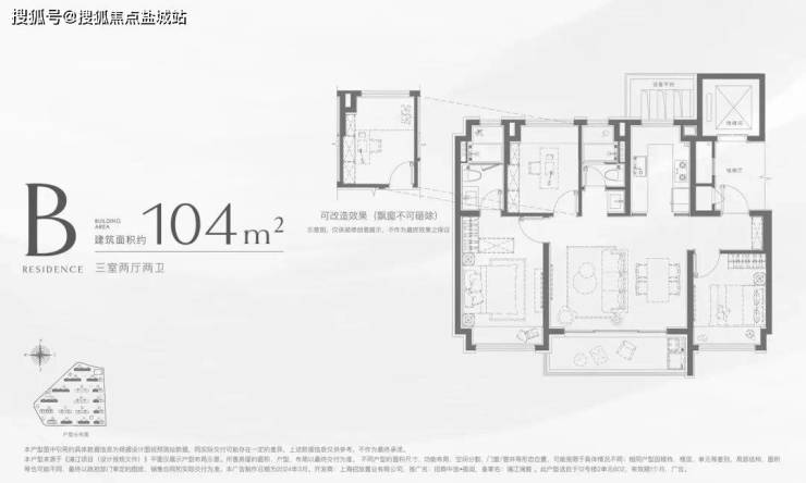 建面约104㎡3房2卫:
