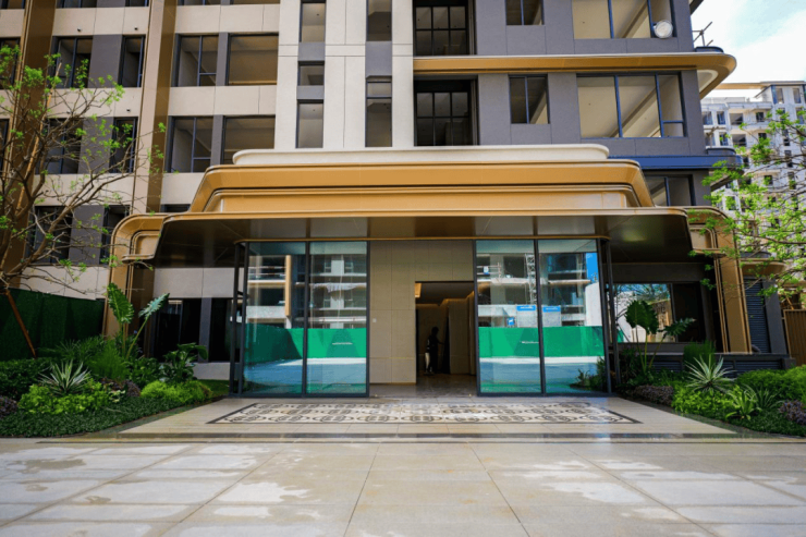 就连回家的大堂都在呼应这份精致——玫瑰金铝板弧形设计和外立面的流体感搭得恰到好处,再配个大玻璃门,一推开门就有“住高端酒店”的仪式感,朋友来做客都得追问:“你家这小区也太会设计了吧?”
