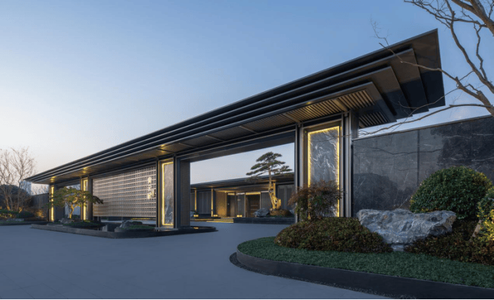 尚云赋的南侧主入口,重檐门庭、金属格栅、意趣昆石,搭配约70万珍稀古树,还原宋画中深宅大院的威仪。约57米恢弘尺度,媲美南京总统府门庭气度。东侧主入口,单是两株苍劲黑松,价值就达百万。其门头投入之重,可以想见。