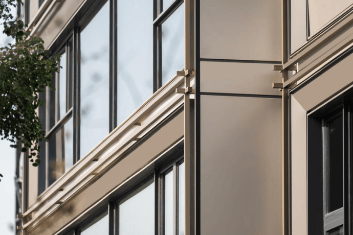 区别于其他楼盘建筑立面以玻璃+铝板+真石漆为主材,尚云赋1-3层全铝板干挂,4层以上65%为铝板型材,匹配大面积玻璃,形成“无界镜面”的通透、硬朗质感。