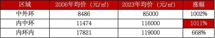 过去从2006,到2023年的17年间,无论是中外环还是中内环, 中环周边的板块新房涨幅都远远领先于内环内!