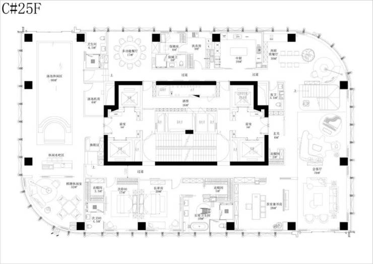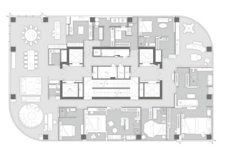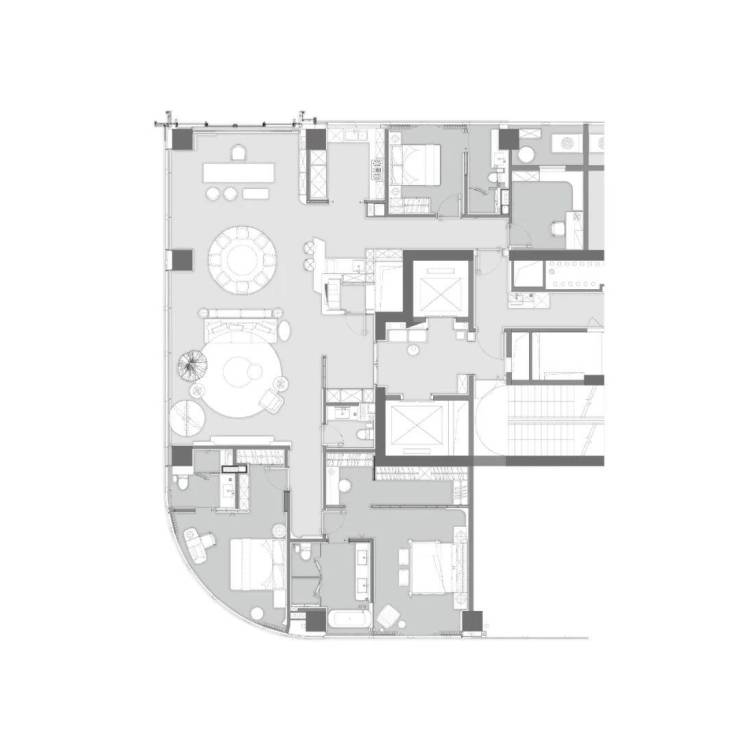 该户型由GFD广飞设计事务所创始人叶飞老师设计,共有五个套房+三个厅(两个小厅+一个餐客双厅)且带保姆房、司机休息室及300方私家屋顶花园。
