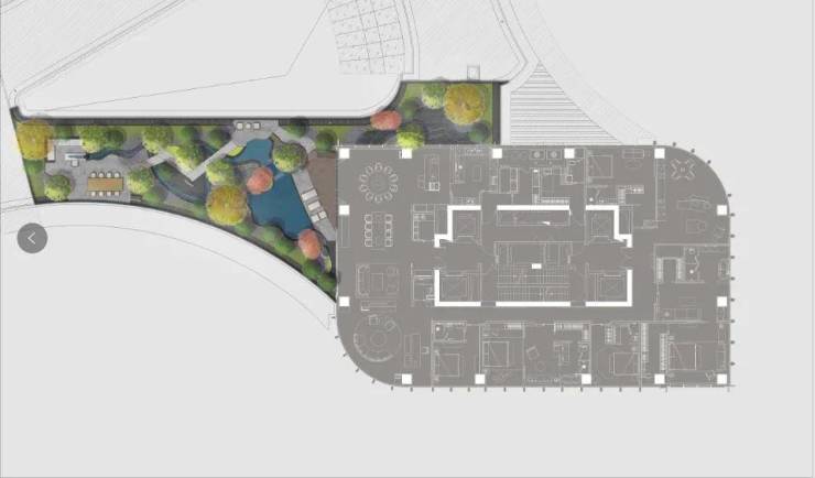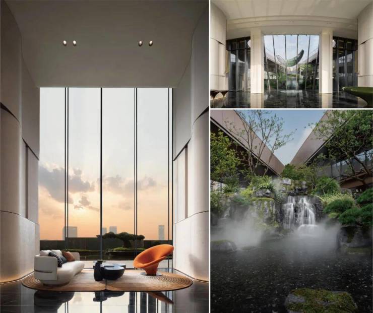艺术风帘水幕,搭配名贵沙朴植种,彰显归家轴线的仪式感;近40米超宽挑檐大堂,以艺术作品感的形态与镜面艺术水景交相呼应,太阳纹定制铺装,营造出全球顶级酒店风格的落客区环岛,盛迎【胤璞】名仕归;更打造“不离繁华而获山林之怡,大隐于市而有林泉之欢”的绿景宁谧空间,俯拾自然野趣。