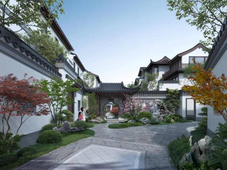 在手法上,汲取江南造园精髓,复刻水乡记忆,在园林中叠山理水,复兴中国文化高峰时期的宋韵美学,打造亭台楼榭、小桥流水,营造出了江南中式步步尊崇的三重归家礼序