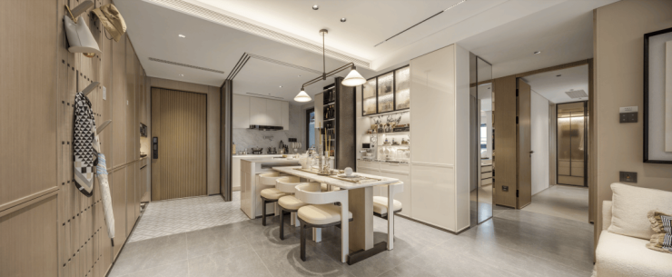 玄关S墙设计,同样包含MAX巨量收纳;创新性采用了钢琴键收纳,600万级的刚需项目中能享受大几千万的豪宅配置;