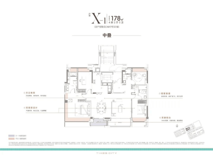 中平户型以四开间朝南的IMAX级采光面,打造出堪比市区豪宅的尺度感。4房4飘窗2阳台的设计,配合双套房布局,一共有三个套房,让每个家庭成员都享有独立私密空间。
