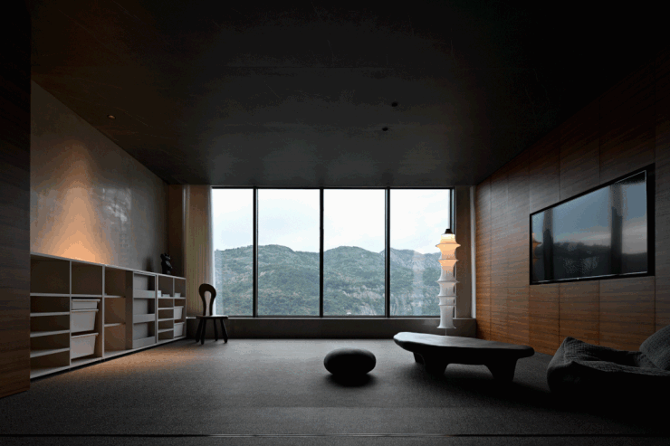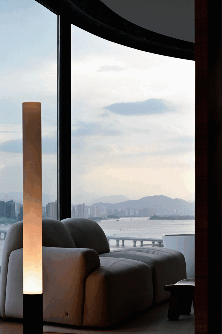 而至于城市的边界感,则来自于围绕整个空间的江水与山林.远处林立的高楼,蔚蓝的湖面,层起的山川与一望无际的天空……一日中最寂静的时刻,你于窗前落座,这山水也好,这都市也罢,早已融为一体.