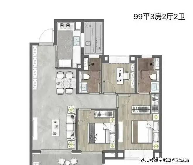 不得不说,建面约99㎡3房2厅2卫主力总价在千万级,“一步到位”精装3房,是市区置业优选户型!