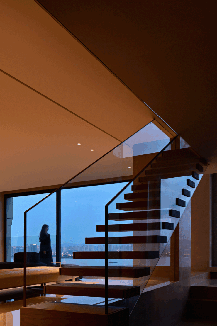空间的主题落于项目中心的透明楼梯,在夜幕初降之时,楼梯的扶手仿佛消失于空气中,唯余步步阶梯,恍若悬空般层层而上,这亦是关于标题,“天空之境”的回答.