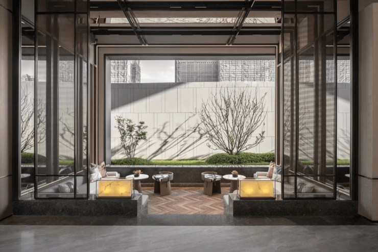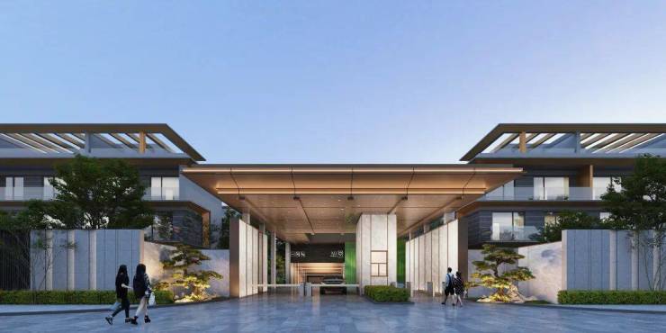 轻中式现代简约立面,香槟棕线条勾勒大气建筑轮廓,巧妙搭配通透玻璃,缔造符合当代审美的质感,重塑城市封面形象。