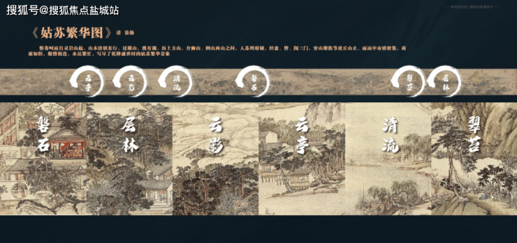 项目参考《姑苏繁华图》为背景,将清代苏州城的繁华盛况融合现代景观元素,提炼出「磐石、层林、云影、云亭、清流、翠台」六大场景,每个区域都展现着独特的设计理念和艺术氛围,并传递出居住环境的生态氛围。