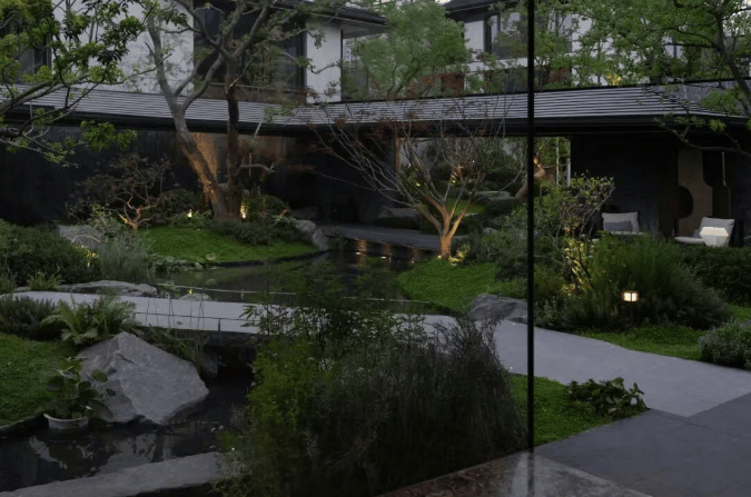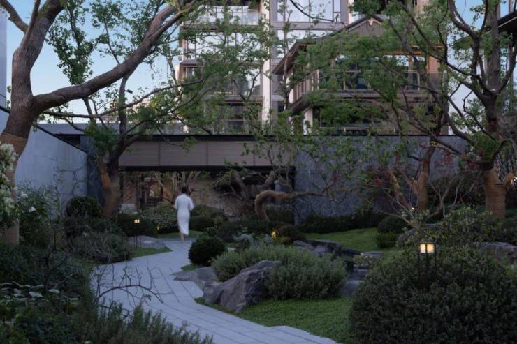 知屿雲璟以《四景山水图》为蓝本以楼阁、溪桥、林木、湖面、廊桥、院巷等景观互穿互映,构建出“一带一轴一环九巷”的立体园境,移步异景,错落有致,宅园合一,以宋意织就静谧之心。