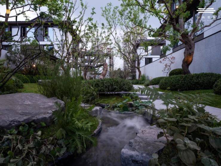 门庭之后,踏水归廊。以宋代「曲水流觞」的雅集中汲取灵感打造的「入园过渡空间」,归廊两侧是浅滩水景以手工雕刻的「安哥拉黑光面水切景石」形成「如波浪般的弧形纹理」,当水流经「潺潺轻响」行走其间,仿佛置身于「万家明月悬 秋浦,千尺飞虹锁暮流」的诗意场景。