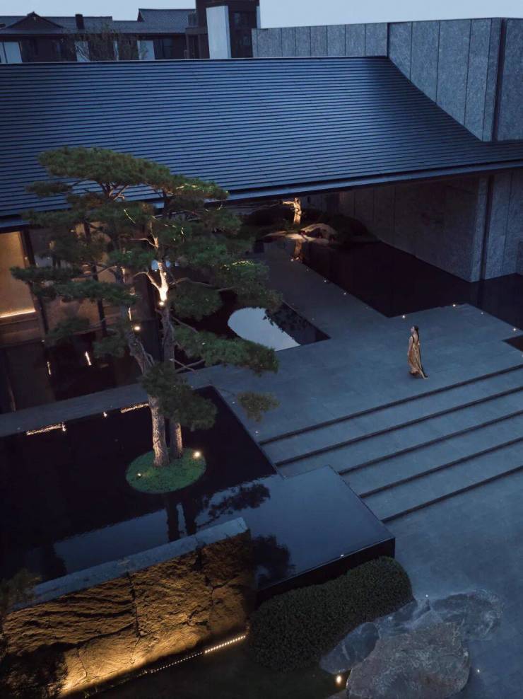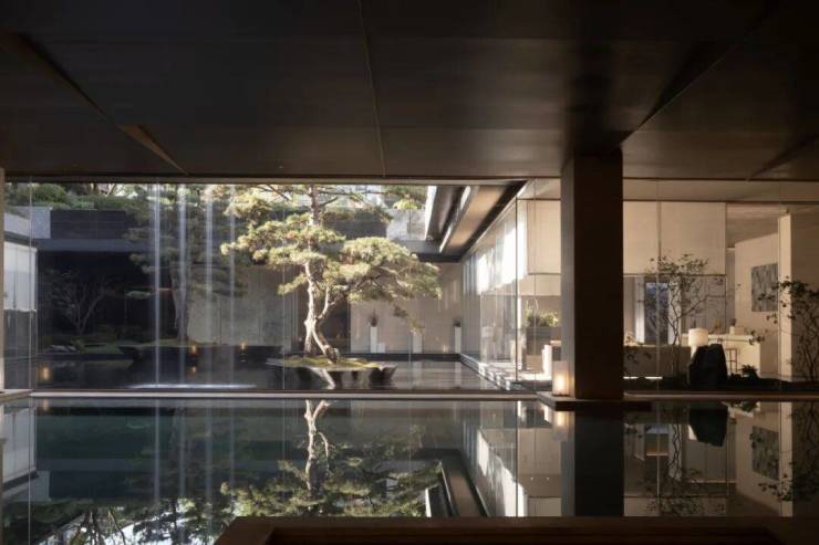 从严选石材铺就的下沉式空间,拾阶而下,在眼前盛放的是一幕幕风雅意蕴。全幕的落地玻璃直面松间石意,天光云影,让身体与精神在一次深呼吸中同步更新。