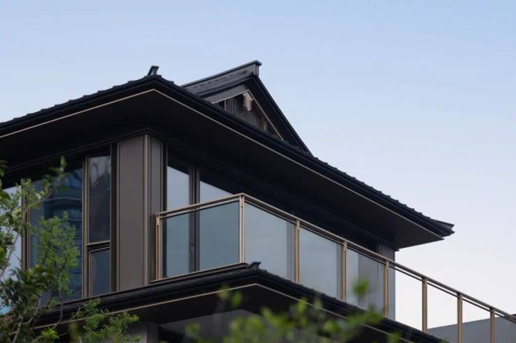 轻盈的金属鱼鳞瓦阵列,在当代工艺下精准复刻宋式歇山顶的优雅轮廓;铝板、石材与超白玻构成的通透立面,延展出极致的空间感;精心设计的博风板与悬鱼构件,于山墙顶端勾勒出简约的宋代符号;纤细的金属栏杆则巧妙呼应着宋画中常见的凭栏意象;而在屋宇转折处,经过抽象提炼的戗脊线条,利落地划破天际......