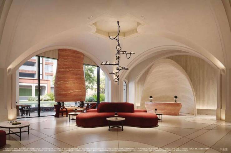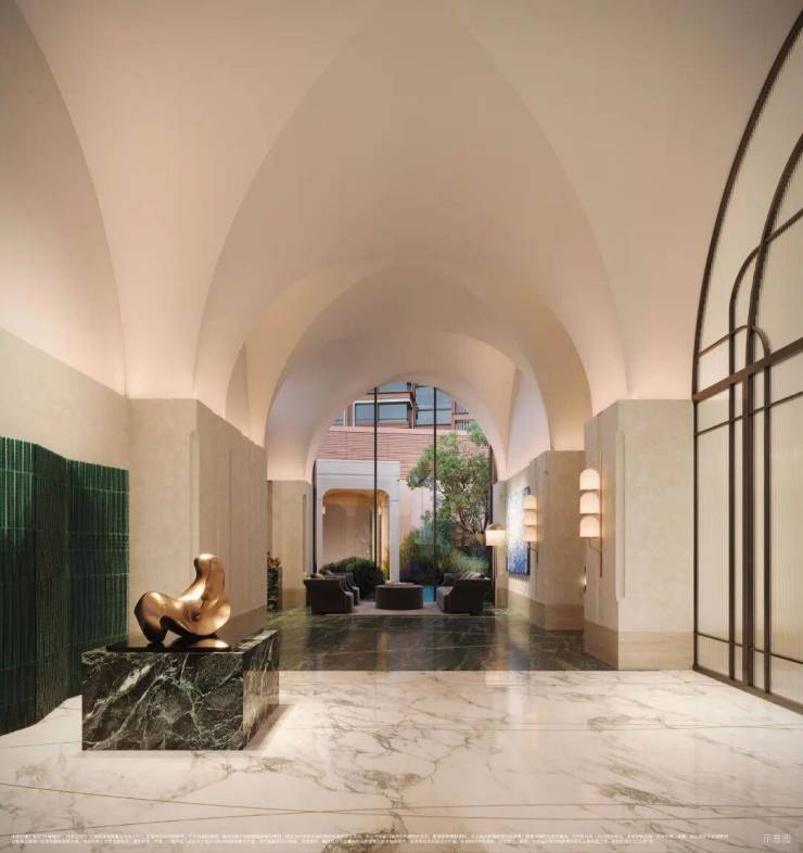 进入之后,通过酒店式入户大堂衔接艺术感极强的 全域风雨连廊 归家。