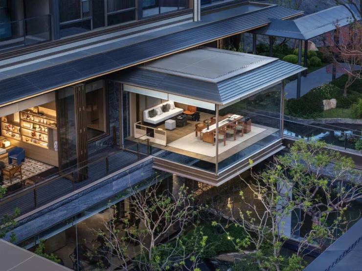 在三面悬空,像是悬浮在水景之上的 悬亭茶室 ,是观看下沉庭院景观的最佳位置。无论是喝茶、聊天还是聚会,都是绝好的场所,业主面子直接满级。