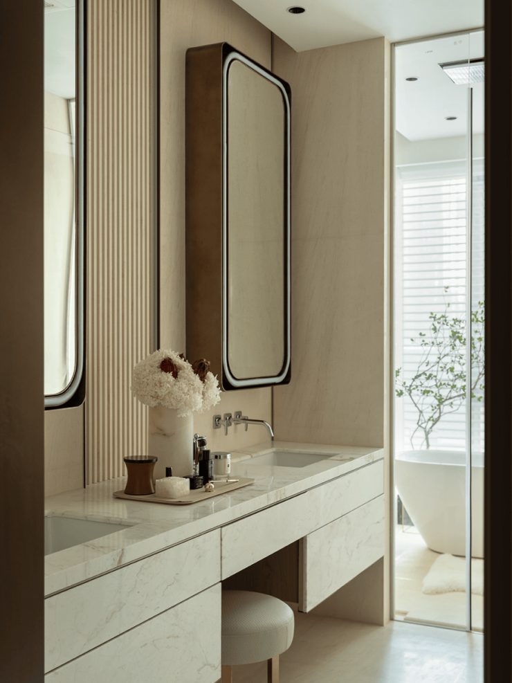 主卧延续了以米白和粽色为主的基调,打造出高级舒适的休憩之所。精炼的设计呈现出优雅整洁,简约而奢华的现代美感,在静谧之域中,安放生活的自在与柔软。