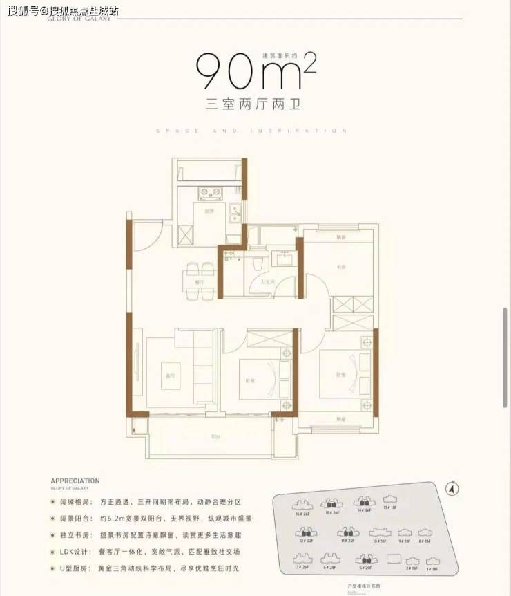 90㎡户型为项目首开的主力户型,三房两厅一卫设计,三开间朝南,较为方正,次卧和客厅双阳台设计,非常常规且实用的户型。
