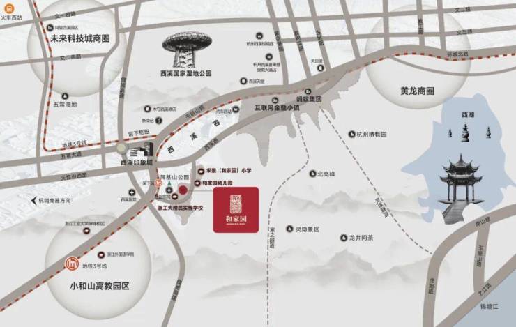 从和家园出发,沿西溪路、天目山快速路等东西向主干道或地铁3号线畅达黄龙-西湖-武林、钱江新城等商圈,生活尽享从容便捷