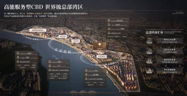 追随杭州“城市东扩、拥江发展”的主旋律,钱江新城2.0接棒钱江新城一期世界杭州主场价值,以“未来总部湾、滨水新潮岸”为总体定位,建设杭州最高能级的产业总部集聚区,打造世界级滨水文化带,构建生态生产生活“三生融合”、宜居宜业宜游“三宜一体”的未来城区。