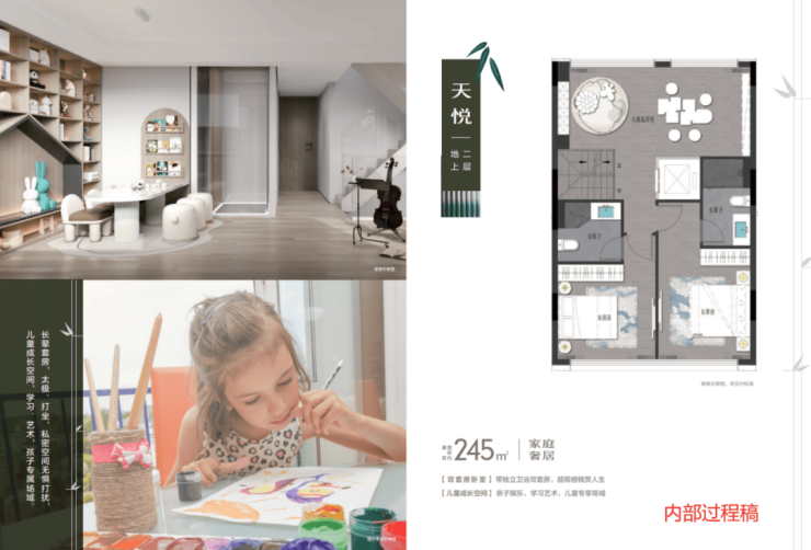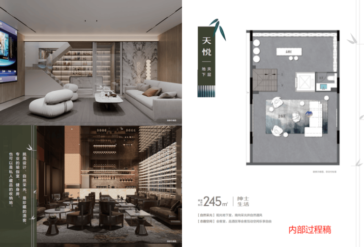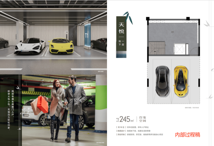 约245㎡的联排户型,更是尺度惊人!此户型上下一共做了6层,地下一层配置双车位,停车即可入户;地下室之上为夹层空间,可做健身房、瑜伽室等;地上一层则带了一个庭院和大餐客厅;地上二层、三层、四层均为静区,2个豪华大主卧+2个豪华套房配置,关注每位家人的需求。