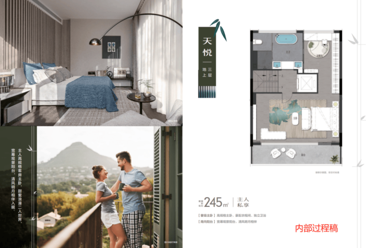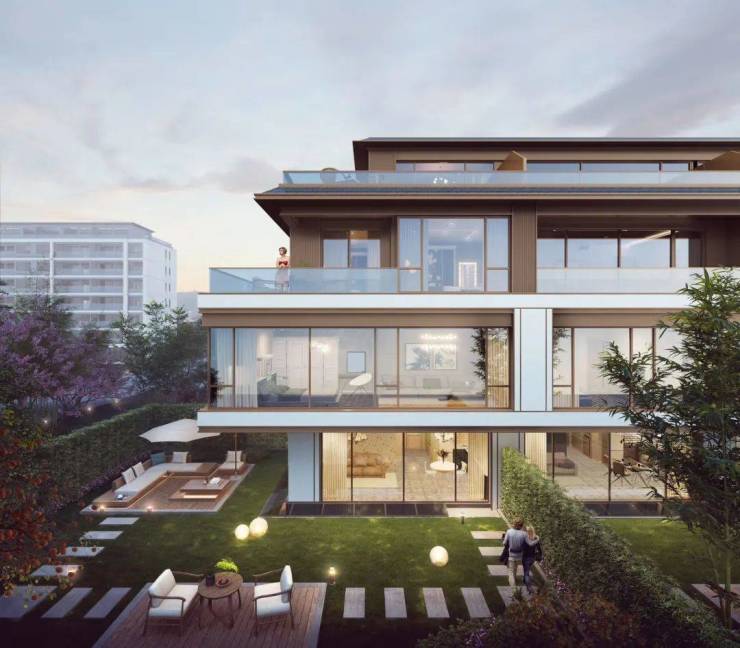 而联排部分,则是暖色调的木纹色系,配合大面积的玻璃窗,一楼是大幅落地玻璃,三楼的边套户型,并设计了巨大的露台,尽显大气华丽。