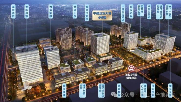 中建企业天地位于国家会展中心西侧约1.2公里处,且处于2号线国家会展中心站再往西延伸一站的潘祥路地铁站正上盖,其一期项目又距离17号线蟠龙路站直线约800米处,项目北侧740米处即为崧泽高架的入口,交通出行相当便利。除了地理位置交通与西虹桥核心商务区的其他楼盘有诸多相似之处外,中建企业天地顶着世界500强央企——中建八局打造的光环,覆盖了从甲级标准办公,独栋总部办公,配套商业,精品酒店,长租公寓等多样业态,加上中字打头方方正正玻璃幕墙的设计,深受追求户型正使用率高的企业青睐。