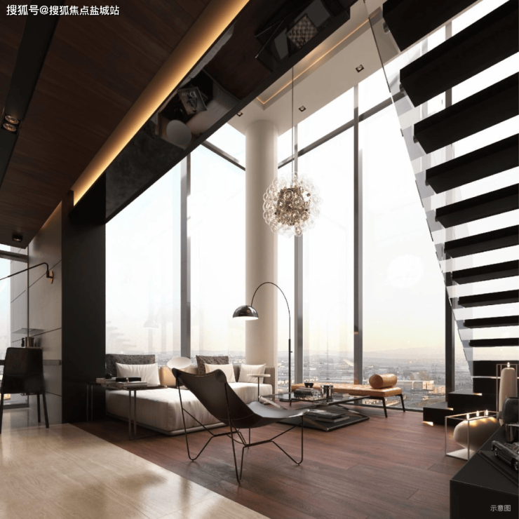 再加上阳台采用特殊钢结构吊台承重,三面均为LOW-E超白玻;而将观光电梯均放在北侧,则是充分保障室内全屋朝南,使观景采光效果达到最佳。