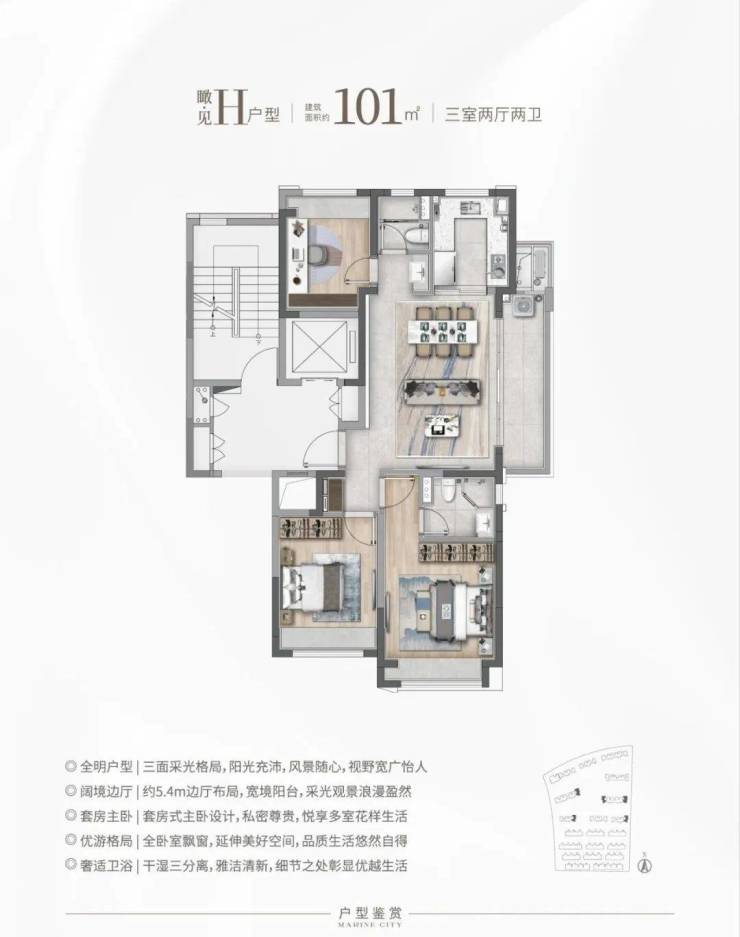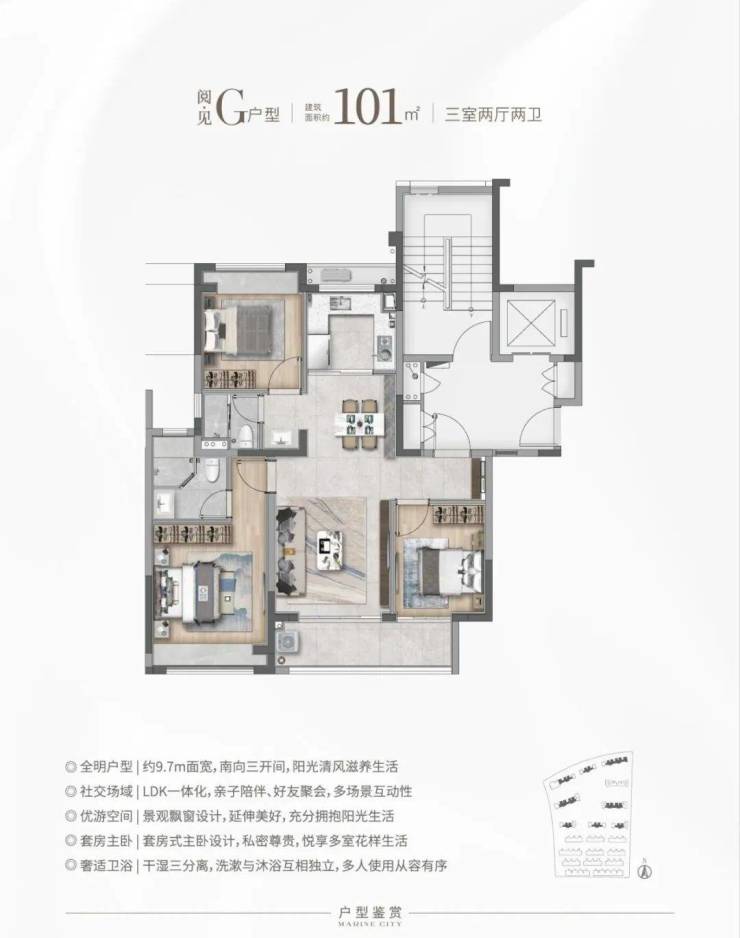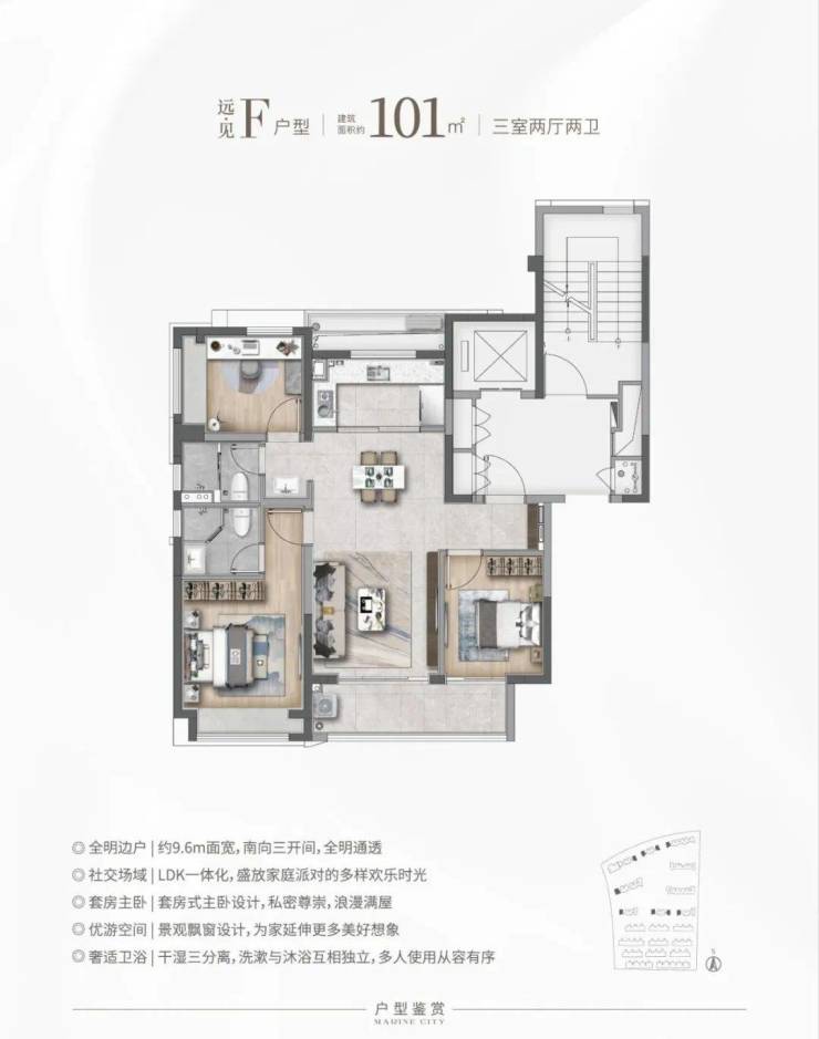 建筑面积大约 101㎡的 F 户型与 G 户型皆为市场上深受认可的经典飞机款户型。